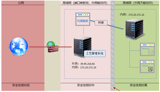 產品生產加工工藝展示系統的APP獨立一臺服務器,這個服務器能被外網訪問。系統訪問的數據庫及工藝文件在另外一臺服務器,而這個服務器是不提供外網訪問的。
