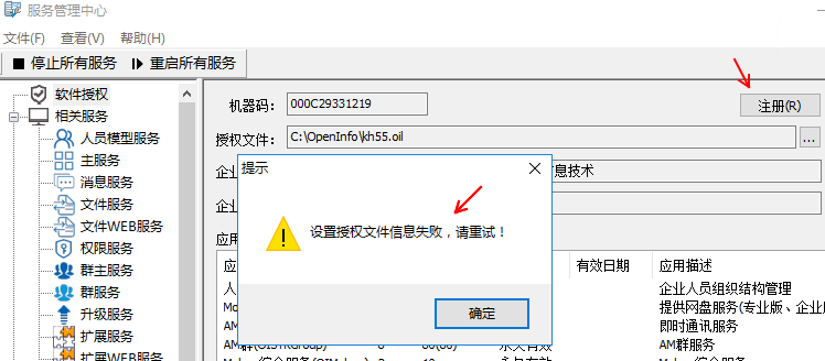1、在注冊的時候,出現《設置授權文件信息失敗,請重試!》