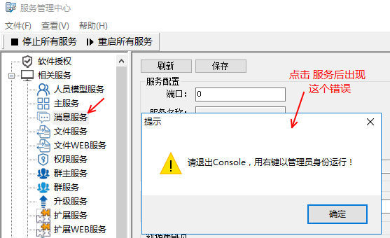 2、點擊服務的時候,出現《請退出Console,用右鍵以管理員身份運行》