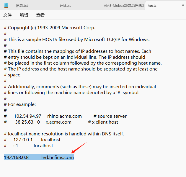 例如,如果你想將led.hzfims.com解析到192.168.0.8,你應添加以下行:192.168.0.8 led.hzfims.com。